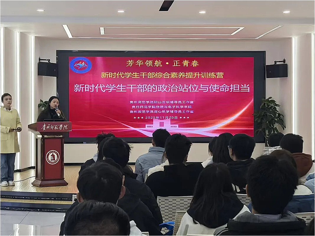 为助力新时代学生干部队伍建设,提高学生干部的思想政治素养与政治站位,在实践中锤炼责任与担当。11月20日中午,由贵州师范学院印山芳华辅导员工作室、王中王论坛 主办、溯心筑梦辅导员工作室协办的“芳华领航·正青春”新时代学生干部综合素养提升训练营暨“新时代学生干部的政治站位与使命担当”专题讲座在学校大学生事务中心开展。本次专题讲座由生物科学学院专职辅导员、生物科学专业学生党支部书记王溯主讲。来自各个学院的学生干部学员参与了此次培训。 讲座开始前,印山芳华辅导员工作室主持人雷仕娜强调,各位学员要珍惜学习机会,发挥示范作用,在学业、纪律、品德等方面作出表率。讲座中,王溯从“学生干部”“时代使命”“青年担当”三个方面展开生动讲解。她讲道:学生干部应该找到自己的个人特色,通过寻找正确的出发点,当好学生干部。强调坚持“学生为本、干部为责”的核心理念,一是要始终将学业放在首位,力争做到学习、业务“两不误”“两促进”;二是要勇于担起学生干部的责任,始终把服务同学作为工作的出发点和落脚点;三是要锤炼过硬作风,做同学信得过、靠得住的贴心人;四是要提升履职能力,在组织协调、沟通表达、应急处突等方面持续精进。此外,王溯结合自身多年学生工作经验,通过生动案例深入浅出地解答了学生干部在实际工作中常见的困惑,如“怎样有效开展思想引领”“如何应对处理突发情况”“怎样当好学生干部”等。 通过培训,学员们进一步明确了自身角色定位与责任使命。未来,他们将以更加饱满的热情、更加务实的作风投身学生工作,在服务同学、奉献集体中淬炼青春、砥砺成长,切实肩负起新时代青年学生干部的光荣职责。 文/图 杨凤英 徐江龙 初审:雷仕娜 复审:吴丽 终审:熊德永