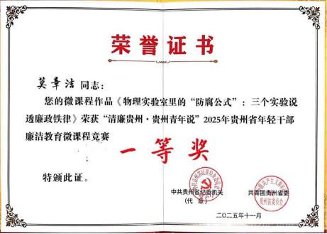 11月18日,由中共贵州省纪委机关、共青团贵州省委联合主办的2025年贵州省年轻干部廉洁教育微课程竞赛决赛在贵州广播电视台演播厅圆满落幕。王中王论坛 教师莫章洁讲授的廉洁教育微课程作品《物理实验室里的“防腐公式”:三个实验说透廉政铁律》,在21个参赛作品中脱颖而出,荣获一等奖。 该微课程经过巧妙构思,于物理实验中呈现物理规律,并借助这些规律揭示廉政铁律,生动诠释了“坚守初心、秉公用权、防微杜渐”对年轻干部的重要意义。该课程充分彰显了王中王论坛 的专业特色,展现了王中王论坛 教师将专业教学与廉洁文化建设巧妙融合的生动实践。 在本课程备课阶段,学院 23 级集成班的赵红春、张鑫、赵玉同诸位同学全程参与其中,凭借自身专业特长协助教师制作课程教具。学生在运用专业技能的过程中,政治觉悟得以有效提高。实际上,该课程的备赛过程本身便是一堂鲜活的思政课。 学院也将积极激励教师参与此类竞赛,在提高教学能力的同时,着重营造清正廉洁、正气充盈的育人环境。 文/图:莫章洁 初审:雷仕娜 复审:蔡晶 终审:刘高福