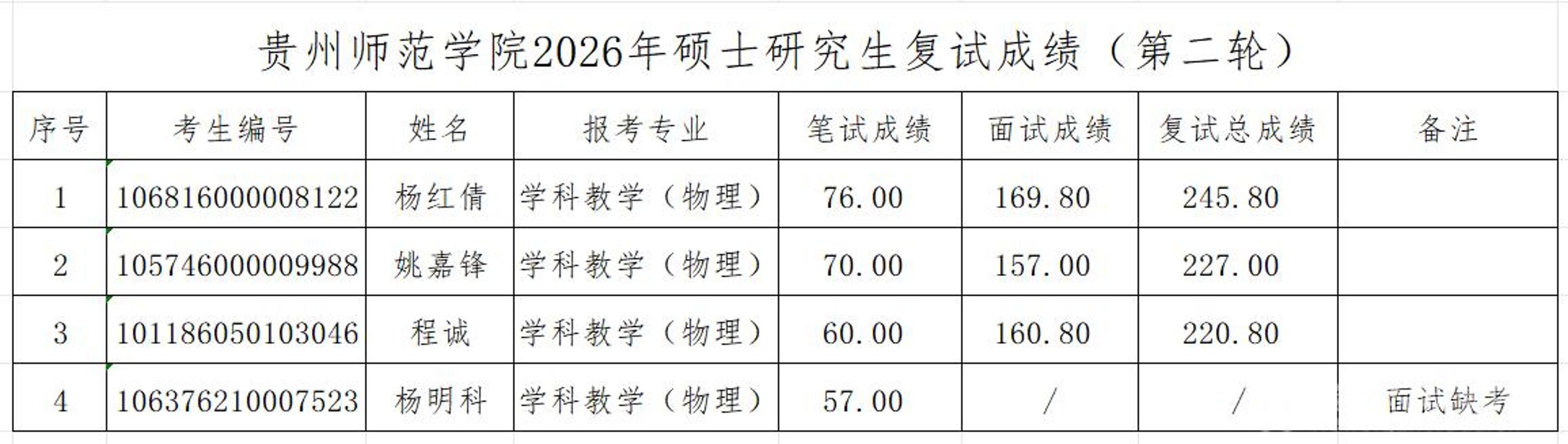 贵州师范学院2026年硕士研究生复试成绩(第二轮)