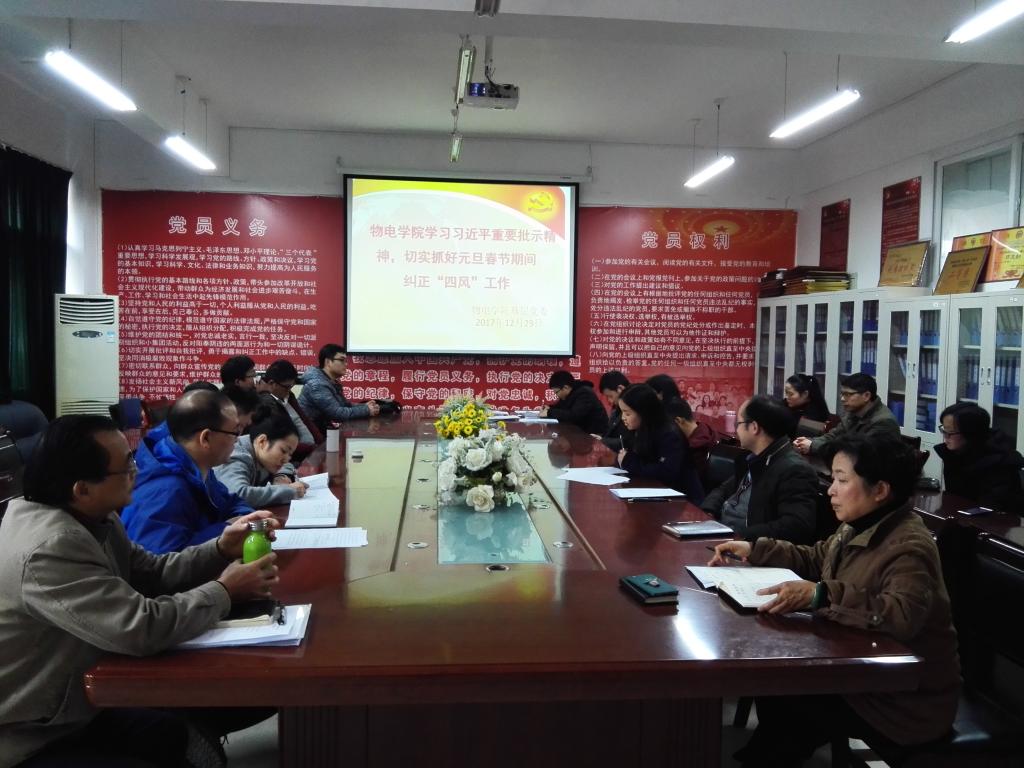 为进一步贯彻落实习近平总书记重要批示精神,切实抓好元旦春节期间纠正“四风”工作,2017年12月29日上午,王中王论坛 组织全体党员教职工认真学习了批示内容。基层党委书记王平瑞主持会议,院长周筑文、副院长陈德良、教工党支部书记刘家兴、基层纪检委员楚亚萍及全体党员教职工参加了会议。 会上,王平瑞强调“习近平总书记的重要批示精神,对深入学习宣传贯彻党的十九大精神,进一步贯彻落实中央八项规定精神、加强作风建设具有十分重要的指导意义。纠正‘四风’不能止步,作风建设永远在路上。” 她还特别指出:2018年元旦、春节将至,为了切实巩固拓展落实中央八项规定精神成果,持之以恒纠正“四风”,进一步严明工作纪律,加强作风建设,确保节日期间风清气正,党员干部在节日期间一定要要认真做到“九严禁”。